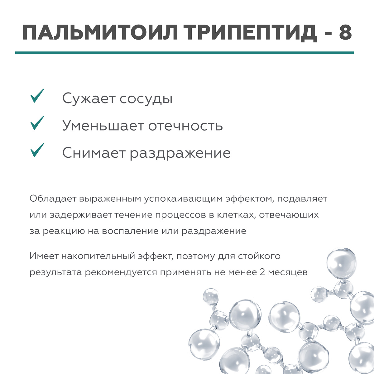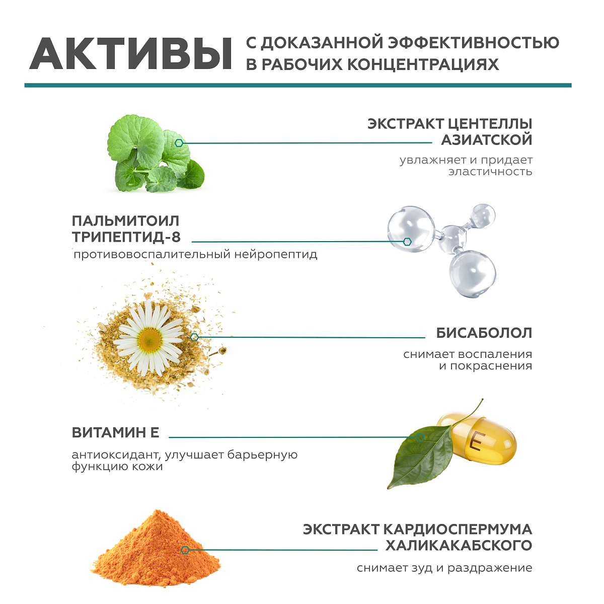 Экстракт центеллы азиатской, бисаболол, биомиметический противовоспалительный нейропептид (Palmitoyl Tripeptide-8) и другие активные ингредиенты в составе флюида оказывают выраженное успокаивающее действие, способствуют облегчению состояния раздраженной, зудящей кожи, восстанавливают поврежденный защитный барьер, ускоряют регенерацию, уменьшают покраснение и отечность.