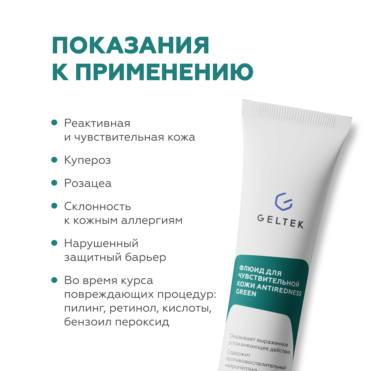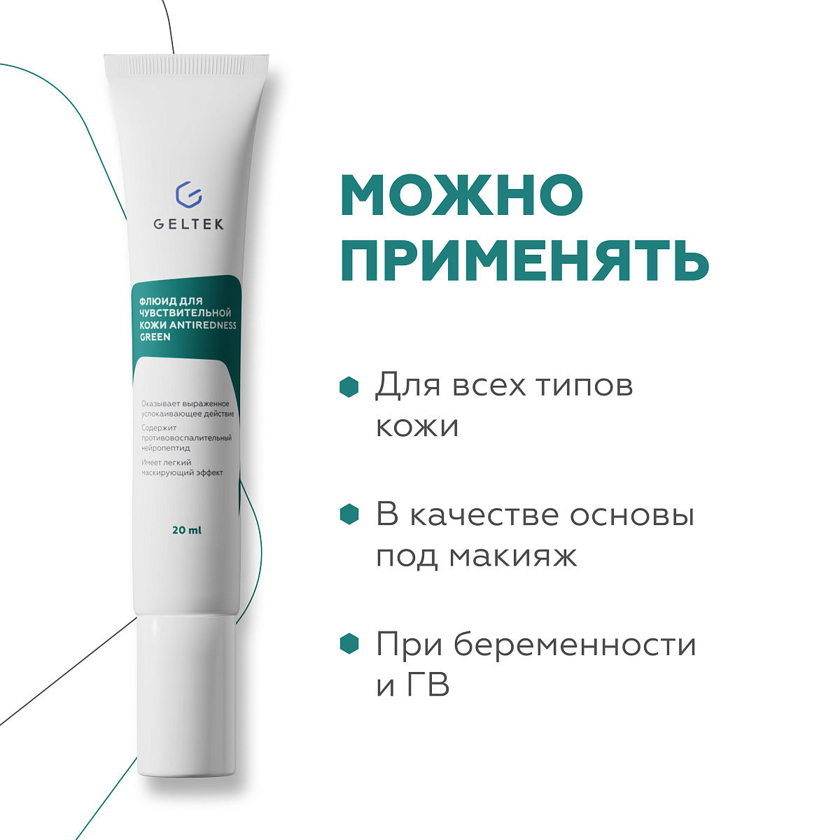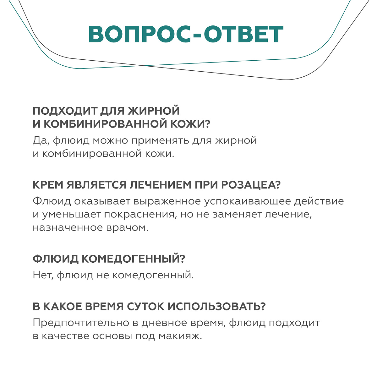 Флюид предназначен для чувствительной кожи, склонной к покраснениям, с сосудистыми проблемами, в том числе при куперозе и розацеа, повреждении ультрафиолетом. Рекомендуется для ежедневного ухода, преимущественно в первой половине дня (имеет легкий маскирующий эффект за счет зеленоватого инкапсулированного пигмента). Подходит в качестве базы под макияж, а для мужчин с чувствительной кожей - в качестве средства после бритья. В профессиональном уходе рекомендуется для снятия раздражения после агрессивных косметологических процедур (пилинги, шлифовки, физиопроцедуры с разогревающим или раздражающим действием).