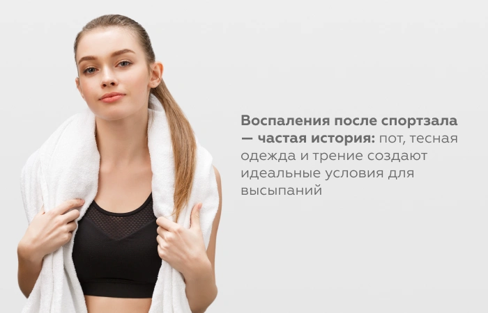 Воспаления после спортзала — частая история: пот, тесная одежда и трение создают идеальные условия для высыпаний